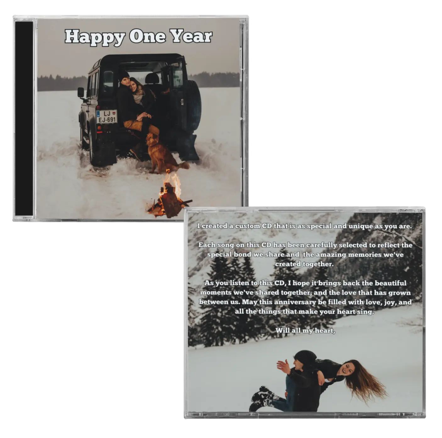 Usually, gifts arenât customized to fit the person receiving them. Good thing our Custom CD's are custom-made to order and designed to fit your unique relationship. Simply choose the photos and songs that speak to you. After that, we'll use our custom software to create a cd with the special photos and songs you choose.